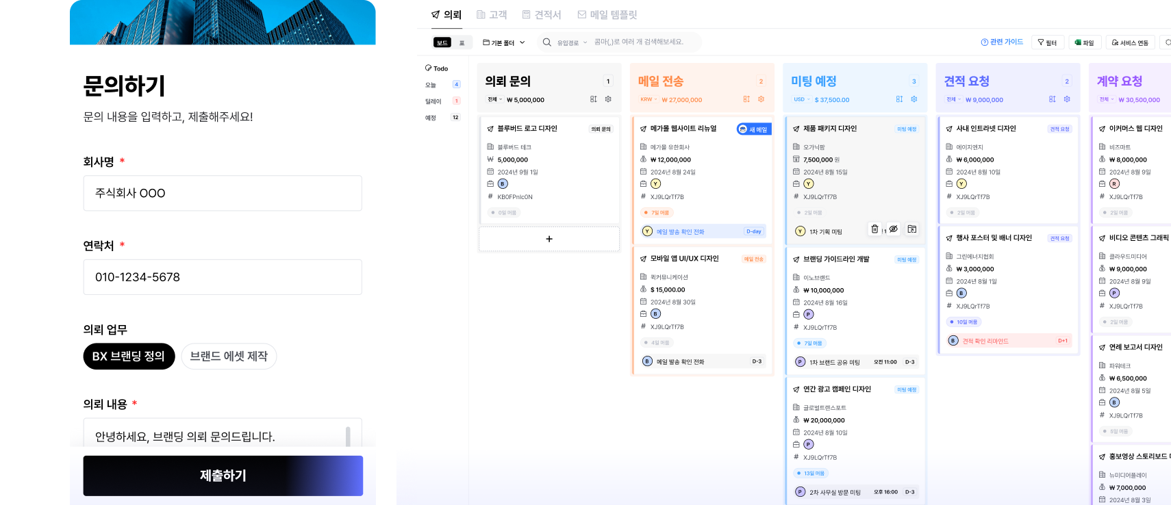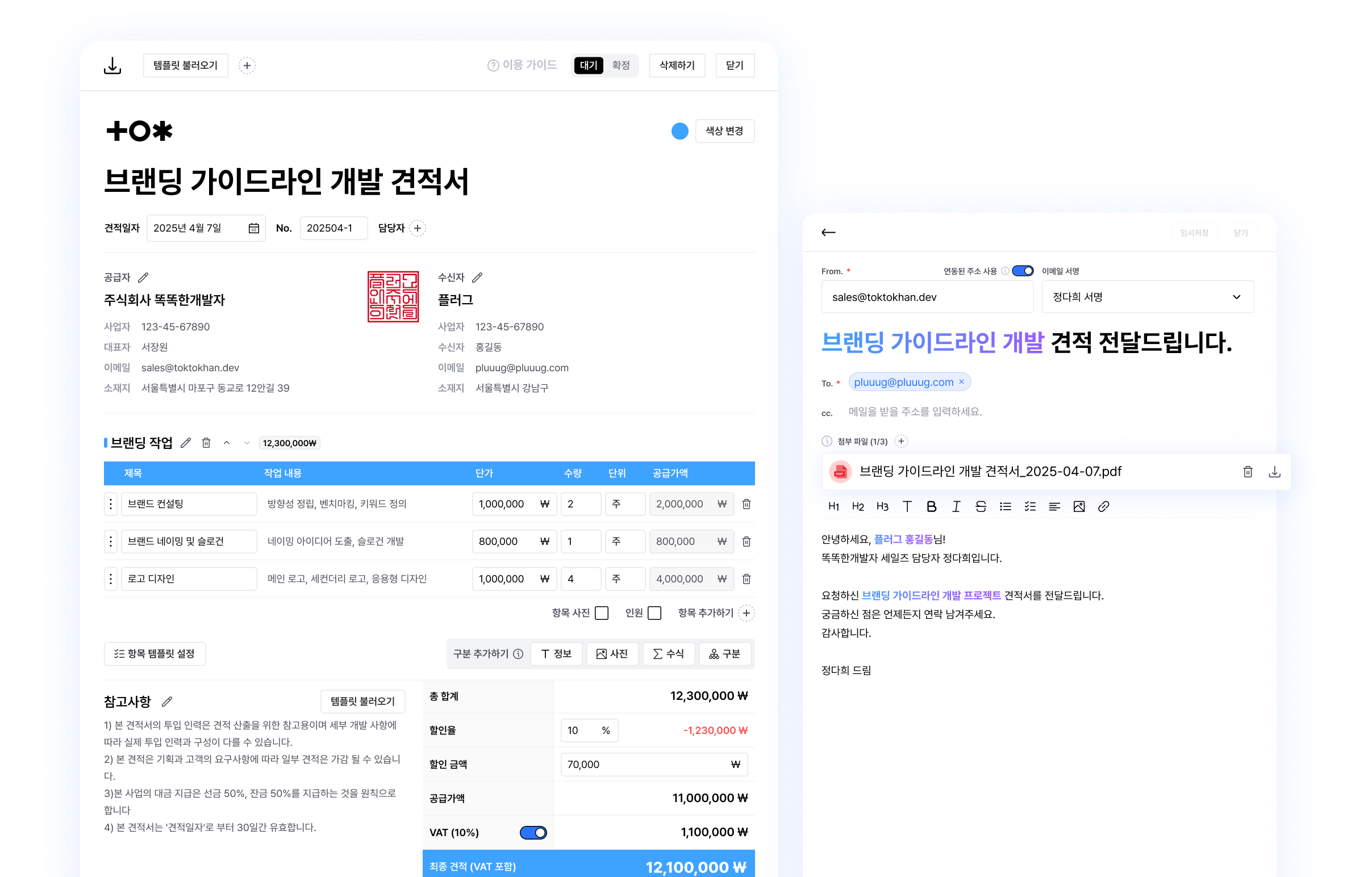 고객과 의뢰 정보를 기반으로 영업 문서를 빠르게 작성해요. 견적서는 PDF를 다운로드 과정 없이 이메일로 즉시 발송해요.