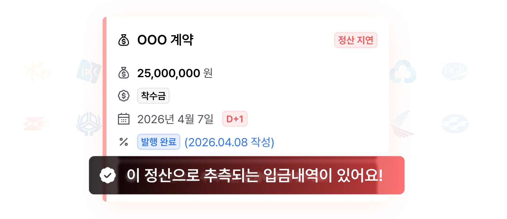 계약 별로 수금 일정을 쉽게 정리하고, 알림을 받아요. 계좌 연동으로 수금을 확인하고, 세금계산서까지 발행해요.