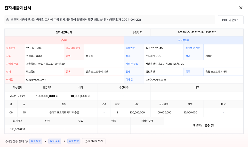 홈택스로 연동되는 세금계산서를 즉시 발행할 수 있어요. 고객 정보와 정산 정보를 바탕으로 초안이 자동 작성돼요.