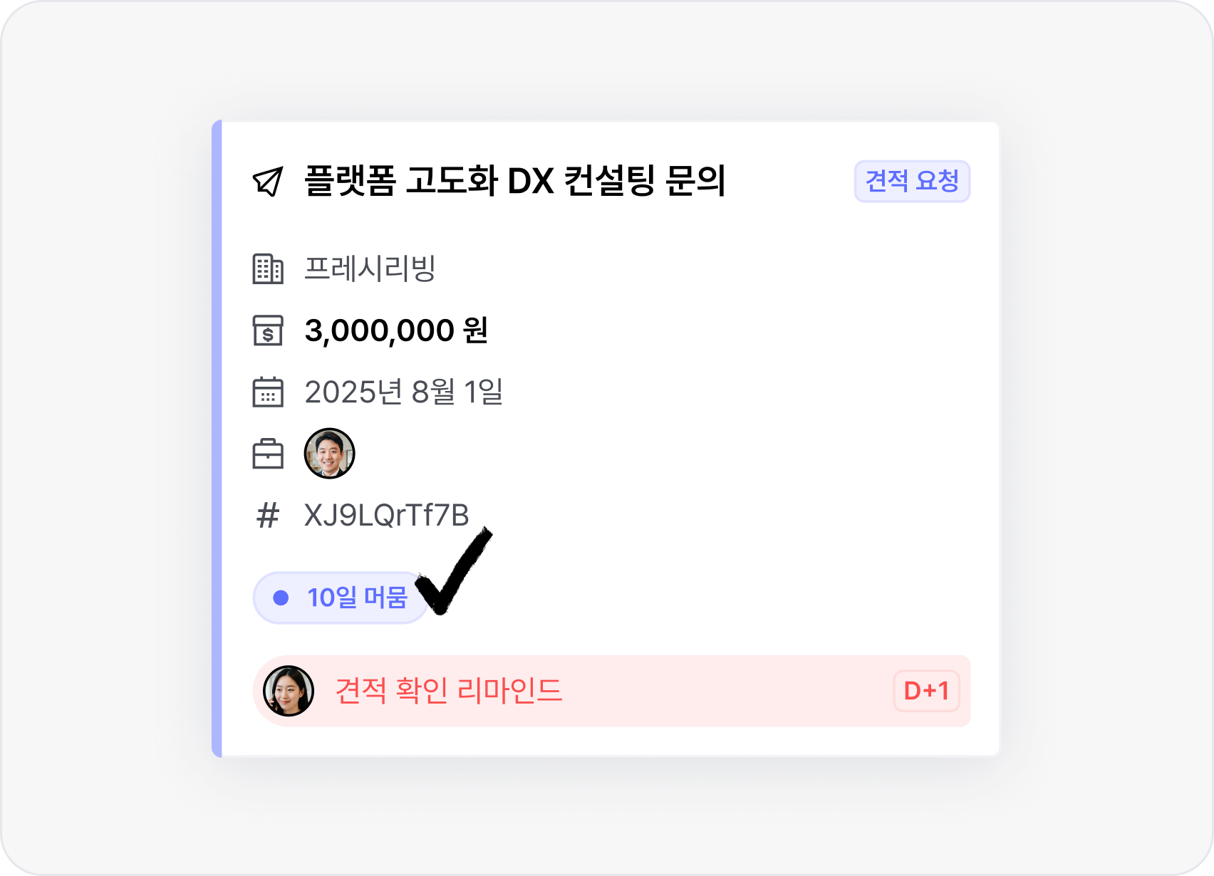 한눈에 확인하는 영업 현황부터, 일부 자동화된 히스토리 관리, 자동 머문기간 체크, 영업 투두리스트 관리까지! 플러그에서 제공되는 기능을 최대한 활용하여 높아지는 영업 성공율을 경험해보세요.